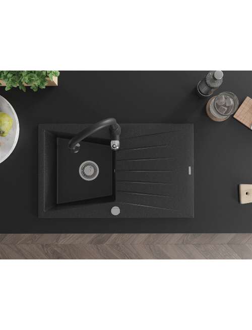 Mexen Cesar zlewozmywak granitowy 1-komorowy z ociekaczem i baterią kuchenną Savita, czarny/srebrny metalik - 6514-73-672601-70