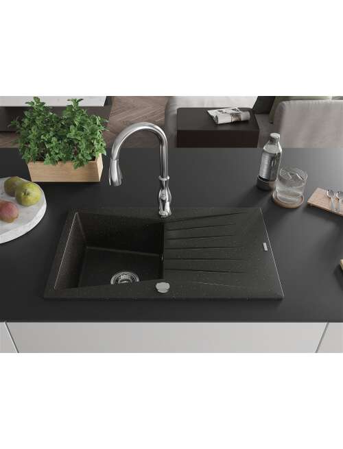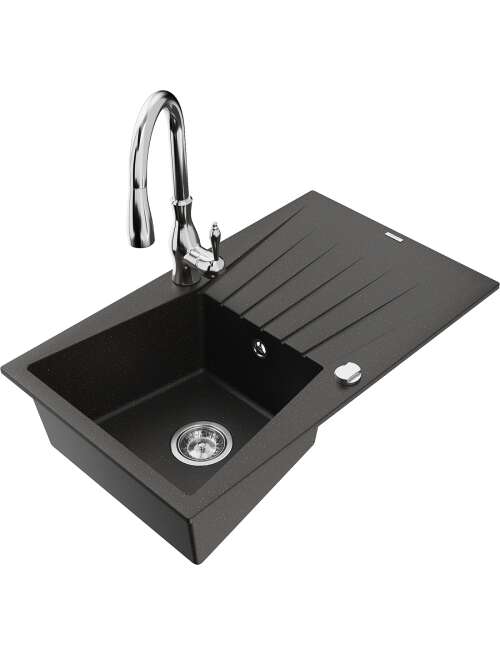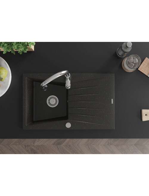 Mexen Cesar zlewozmywak granitowy 1-komorowy z ociekaczem i baterią kuchenną Savita, czarny/złoty metalik - 6514-75-672601-00