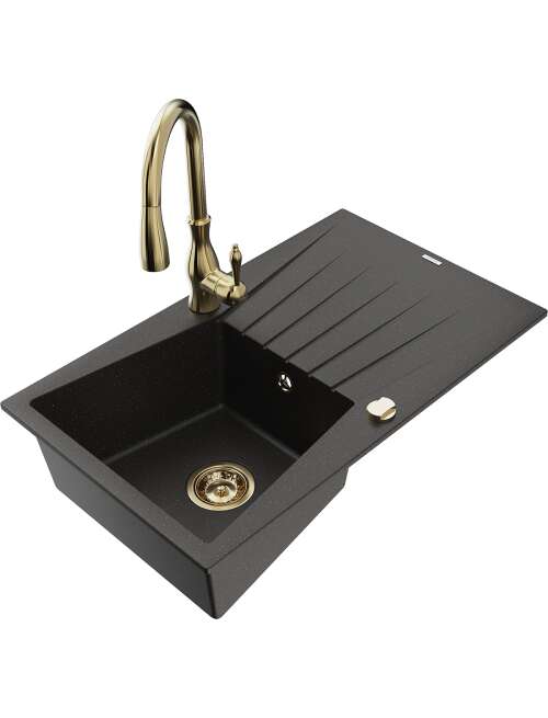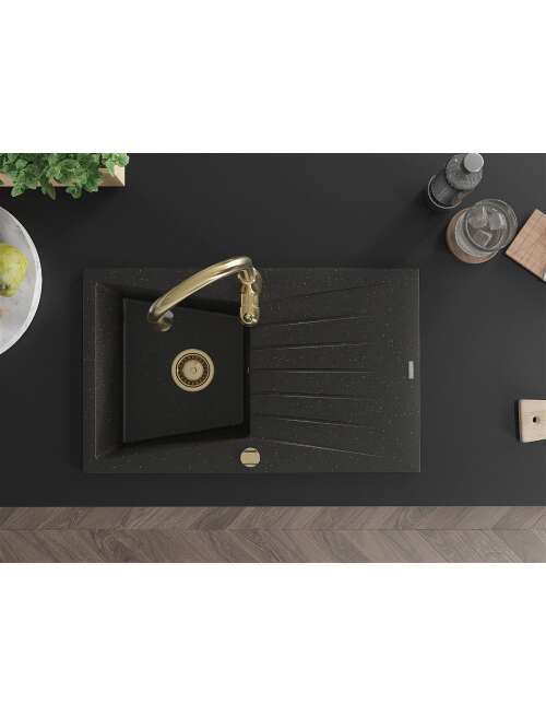 Mexen Cesar zlewozmywak granitowy 1-komorowy z ociekaczem i baterią kuchenną Savita, czarny/złoty metalik - 6514-75-672601-50