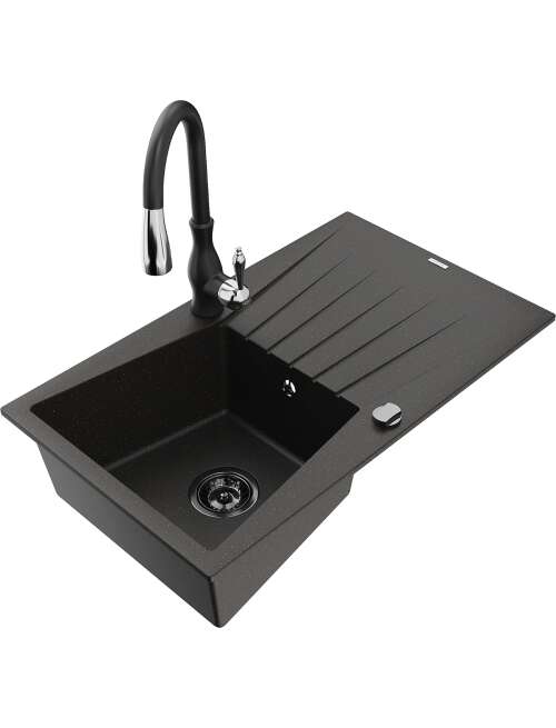 Dane techniczne: Zlewozmywak: Rozmiar: 775x470x200 mm Głębokość komory: 180 mm Wymiary komory: 410x355 mm Średnica odpływu: ø90 mm Typ: 1-komorowy z ociekaczem Rodzaj: Wpuszczany w blat Kolor: Czarny/Złoty metalik Wykończenie syfonu: Czarny Materiał: Granit (80% kruszywo granitowe 20% żywice) Otwór przelewowy: Tak Otwory: ( bateria, automat ) 2 Montaż: Uniwersalny, możliwość montażu z ociekaczem po lewej lub prawej stronie Wysoka odporność na zarysowania i przebarwienia Odporność na szok termiczny Powierzchnia ułatwiająca czyszczenie Bateria kuchenna: Materiał: Mosiądz Kolor: Czarny Głowica: Ceramiczna Perlator: Tak Typ: Jednouchwytowa Wysokość baterii: 410 mm Zasięg wylewki: 231 mm |