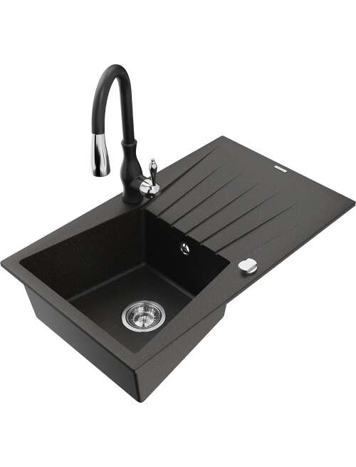 Dane techniczne: Zlewozmywak: Rozmiar: 775x470x200 mm Głębokość komory: 180 mm Wymiary komory: 410x355 mm Średnica odpływu: ø90 mm Typ: 1-komorowy z ociekaczem Rodzaj: Wpuszczany w blat Kolor: Czarny/Złoty metalik Wykończenie syfonu: Chrom Materiał: Granit (80% kruszywo granitowe 20% żywice) Otwór przelewowy: Tak Otwory: ( bateria, automat ) 2 Montaż: Uniwersalny, możliwość montażu z ociekaczem po lewej lub prawej stronie Wysoka odporność na zarysowania i przebarwienia Odporność na szok termiczny Powierzchnia ułatwiająca czyszczenie Bateria kuchenna: Materiał: Mosiądz Kolor: Czarny Głowica: Ceramiczna Perlator: Tak Typ: Jednouchwytowa Wysokość baterii: 410 mm Zasięg wylewki: 231 mm |