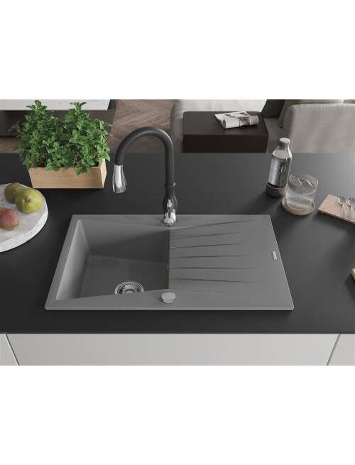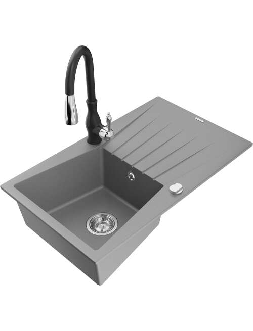 Dane techniczne: Zlewozmywak: Rozmiar: 775x470x200 mm Głębokość komory: 180 mm Wymiary komory: 410x355 mm Średnica odpływu: ø90 mm Typ: 1-komorowy z ociekaczem Rodzaj: Wpuszczany w blat Kolor: Szary Wykończenie syfonu: Chrom Materiał: Granit (80% kruszywo granitowe 20% żywice) Otwór przelewowy: Tak Otwory: ( bateria, automat ) 2 Montaż: Uniwersalny, możliwość montażu z ociekaczem po lewej lub prawej stronie Wysoka odporność na zarysowania i przebarwienia Odporność na szok termiczny Powierzchnia ułatwiająca czyszczenie Bateria kuchenna: Materiał: Mosiądz Kolor: Czarny Głowica: Ceramiczna Perlator: Tak Typ: Jednouchwytowa Wysokość baterii: 410 mm Zasięg wylewki: 231 mm |