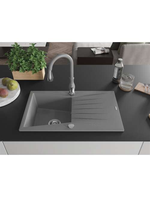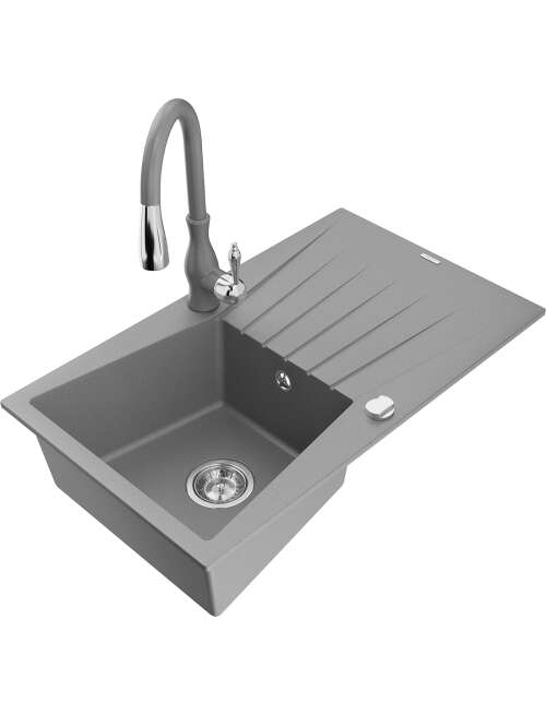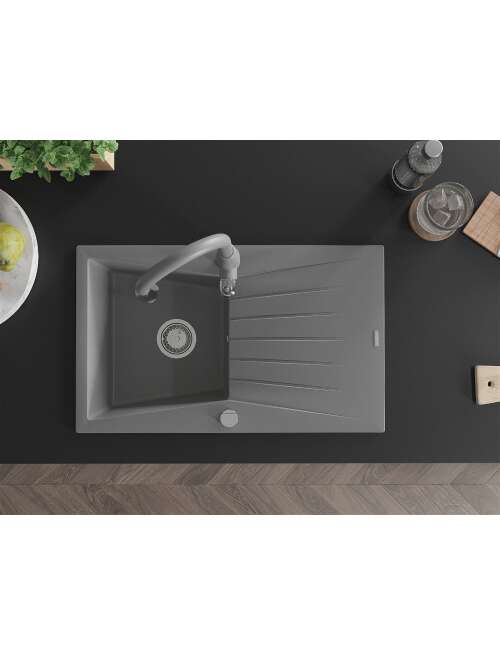 Dane techniczne: Zlewozmywak: Rozmiar: 775x470x200 mm Głębokość komory: 180 mm Wymiary komory: 410x355 mm Średnica odpływu: ø90 mm Typ: 1-komorowy z ociekaczem Rodzaj: Wpuszczany w blat Kolor: Szary Wykończenie syfonu: Chrom Materiał: Granit (80% kruszywo granitowe 20% żywice) Otwór przelewowy: Tak Otwory: ( bateria, automat ) 2 Montaż: Uniwersalny, możliwość montażu z ociekaczem po lewej lub prawej stronie Wysoka odporność na zarysowania i przebarwienia Odporność na szok termiczny Powierzchnia ułatwiająca czyszczenie Bateria kuchenna: Materiał: Mosiądz Kolor: Szary Głowica: Ceramiczna Perlator: Tak Typ: Jednouchwytowa Wysokość baterii: 410 mm Zasięg wylewki: 231 mm |