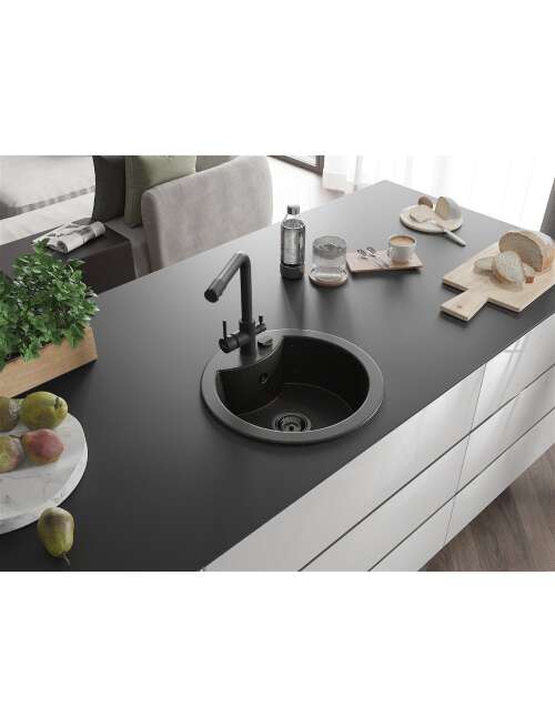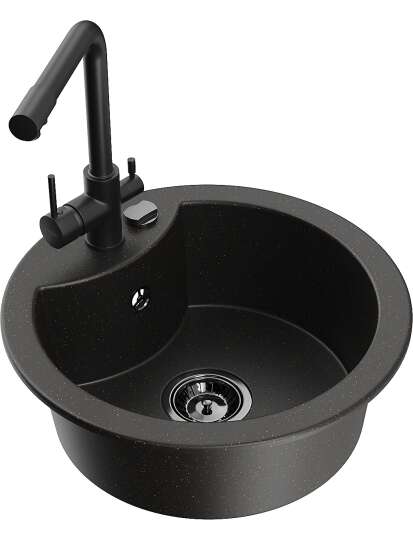 Dane techniczne: Zlewozmywak: Rozmiar: 488x488x167 mm Głębokość komory: 157 mm Szerokość komory: 406 mm Średnica odpływu: ø90 mm Typ: 1-komorowy Rodzaj: Wpuszczany w blat Kolor: Czarny/Złoty metalik Wykończenie syfonu: Czarny Materiał: Granit (80% kruszywo granitowe 20% żywice) Otwór przelewowy: Tak Otwory: ( bateria, automat ) 2 Wysoka odporność na zarysowania i przebarwienia Odporność na szok termiczny Powierzchnia ułatwiająca czyszczenie Jeden dodatkowy podfrezowany otwór do samodzielnego wybicia ø35 Bateria kuchenna: Materiał: Mosiądz Kolor: Czarny Głowica: Ceramiczna Perlator: Tak Typ: Dwuuchwytowa Zasięg wylewki: 235 mm Wysokość baterii: 315 mm Bateria dwugłowicowa z dodatkowym filtrem do wody pitnej |