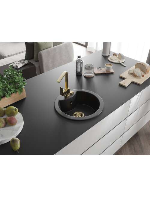 Dane techniczne: Zlewozmywak: Rozmiar: 488x488x167 mm Głębokość komory: 157 mm Szerokość komory: 406 mm Średnica odpływu: ø90 mm Typ: 1-komorowy Rodzaj: Wpuszczany w blat Kolor: Czarny/Srebrny metalik Wykończenie syfonu: Złoty Materiał: Granit (80% kruszywo granitowe 20% żywice) Otwór przelewowy: Tak Otwory: ( bateria, automat ) 2 Wysoka odporność na zarysowania i przebarwienia Odporność na szok termiczny Powierzchnia ułatwiająca czyszczenie Jeden dodatkowy podfrezowany otwór do samodzielnego wybicia ø35 Bateria kuchenna: Materiał: Mosiądz Kolor: Złoty Głowica: Ceramiczna Perlator: Tak Typ: Jednouchwytowa Wysokość baterii: 290 mm Zasięg wylewki: 220 mm |