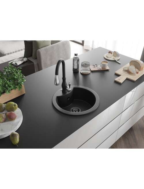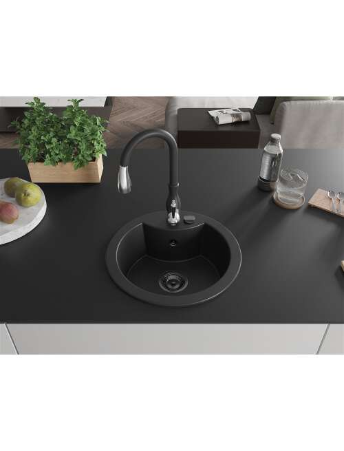 Dane techniczne: Zlewozmywak: Rozmiar: 488x488x167 mm Głębokość komory: 157 mm Szerokość komory: 406 mm Średnica odpływu: ø90 mm Typ: 1-komorowy Rodzaj: Wpuszczany w blat Kolor: Czarny Wykończenie syfonu: Czarny Materiał: Granit (80% kruszywo granitowe 20% żywice) Otwór przelewowy: Tak Otwory: ( bateria, automat ) 2 Wysoka odporność na zarysowania i przebarwienia Odporność na szok termiczny Powierzchnia ułatwiająca czyszczenie Jeden dodatkowy podfrezowany otwór do samodzielnego wybicia ø35 Bateria kuchenna: Materiał: Mosiądz Kolor: Czarny Głowica: Ceramiczna Perlator: Tak Typ: Jednouchwytowa Wysokość baterii: 410 mm Zasięg wylewki: 231 mm |