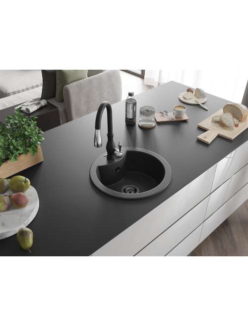 Dane techniczne: Zlewozmywak: Rozmiar: 488x488x167 mm Głębokość komory: 157 mm Szerokość komory: 406 mm Średnica odpływu: ø90 mm Typ: 1-komorowy Rodzaj: Wpuszczany w blat Kolor: Czarny nakrapiany Wykończenie syfonu: Czarny Materiał: Granit (80% kruszywo granitowe 20% żywice) Otwór przelewowy: Tak Otwory: ( bateria, automat ) 2 Wysoka odporność na zarysowania i przebarwienia Odporność na szok termiczny Powierzchnia ułatwiająca czyszczenie Jeden dodatkowy podfrezowany otwór do samodzielnego wybicia ø35 Bateria kuchenna: Materiał: Mosiądz Kolor: Czarny Głowica: Ceramiczna Perlator: Tak Typ: Jednouchwytowa Wysokość baterii: 410 mm Zasięg wylewki: 231 mm |