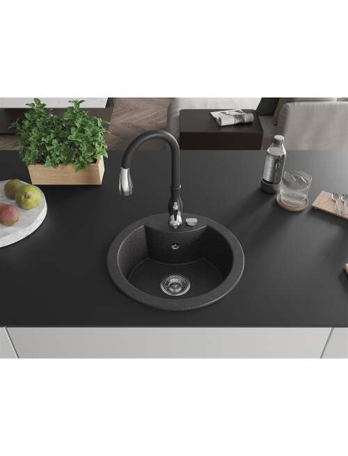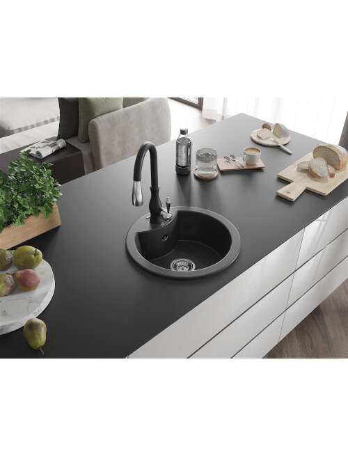 Dane techniczne: Zlewozmywak: Rozmiar: 488x488x167 mm Głębokość komory: 157 mm Szerokość komory: 406 mm Średnica odpływu: ø90 mm Typ: 1-komorowy Rodzaj: Wpuszczany w blat Kolor: Czarny nakrapiany Wykończenie syfonu: Chrom Materiał: Granit (80% kruszywo granitowe 20% żywice) Otwór przelewowy: Tak Otwory: ( bateria, automat ) 2 Wysoka odporność na zarysowania i przebarwienia Odporność na szok termiczny Powierzchnia ułatwiająca czyszczenie Jeden dodatkowy podfrezowany otwór do samodzielnego wybicia ø35 Bateria kuchenna: Materiał: Mosiądz Kolor: Czarny Głowica: Ceramiczna Perlator: Tak Typ: Jednouchwytowa Wysokość baterii: 410 mm Zasięg wylewki: 231 mm |