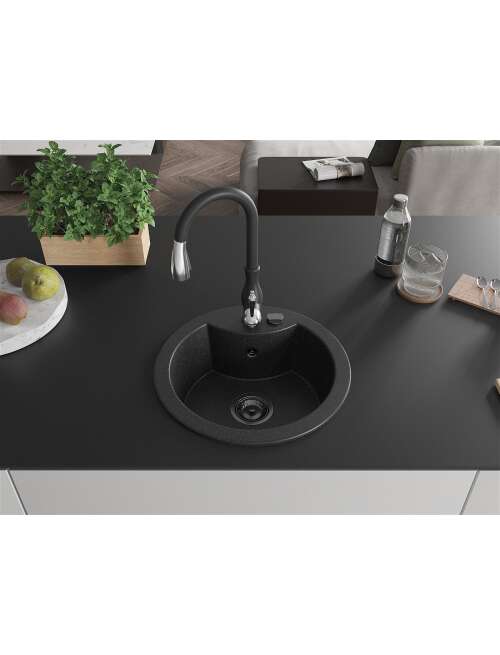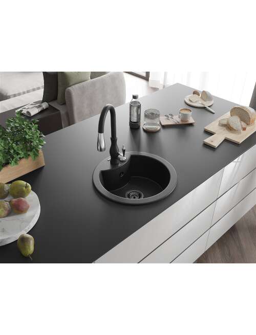 Dane techniczne: Zlewozmywak: Rozmiar: 488x488x167 mm Głębokość komory: 157 mm Szerokość komory: 406 mm Średnica odpływu: ø90 mm Typ: 1-komorowy Rodzaj: Wpuszczany w blat Kolor: Czarny/Srebrny metalik Wykończenie syfonu: Czarny Materiał: Granit (80% kruszywo granitowe 20% żywice) Otwór przelewowy: Tak Otwory: ( bateria, automat ) 2 Wysoka odporność na zarysowania i przebarwienia Odporność na szok termiczny Powierzchnia ułatwiająca czyszczenie Jeden dodatkowy podfrezowany otwór do samodzielnego wybicia ø35 Bateria kuchenna: Materiał: Mosiądz Kolor: Czarny Głowica: Ceramiczna Perlator: Tak Typ: Jednouchwytowa Wysokość baterii: 410 mm Zasięg wylewki: 231 mm |