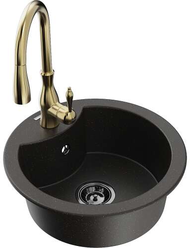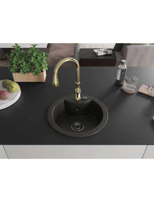 Mexen Diego zlewozmywak granitowy 1-komorowy z baterią kuchenną Savita, czarny/złoty metalik - 6512-75-672601-50-B