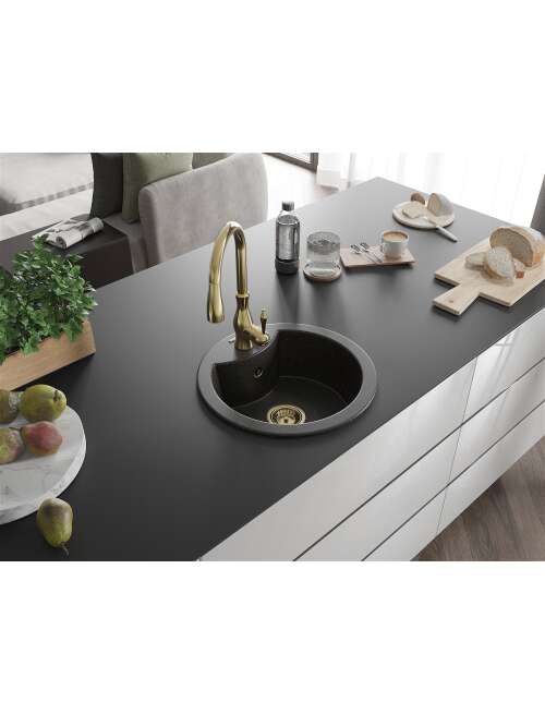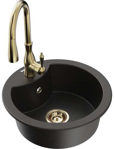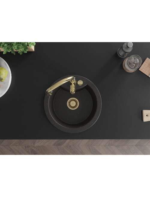 Mexen Diego zlewozmywak granitowy 1-komorowy z baterią kuchenną Savita, czarny/złoty metalik - 6512-75-672601-50