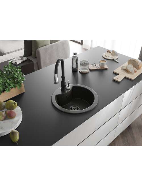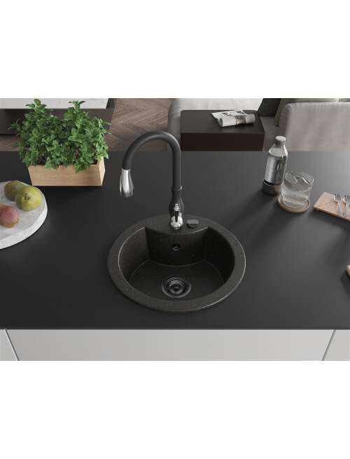 Dane techniczne: Zlewozmywak: Rozmiar: 488x488x167 mm Głębokość komory: 157 mm Szerokość komory: 406 mm Średnica odpływu: ø90 mm Typ: 1-komorowy Rodzaj: Wpuszczany w blat Kolor: Czarny/Złoty metalik Wykończenie syfonu: Czarny Materiał: Granit (80% kruszywo granitowe 20% żywice) Otwór przelewowy: Tak Otwory: ( bateria, automat ) 2 Wysoka odporność na zarysowania i przebarwienia Odporność na szok termiczny Powierzchnia ułatwiająca czyszczenie Jeden dodatkowy podfrezowany otwór do samodzielnego wybicia ø35 Bateria kuchenna: Materiał: Mosiądz Kolor: Czarny Głowica: Ceramiczna Perlator: Tak Typ: Jednouchwytowa Wysokość baterii: 410 mm Zasięg wylewki: 231 mm |