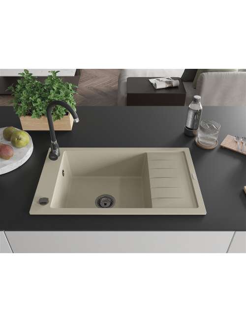 Dane techniczne: Rozmiar: 795x480x200 mm Głębokość komory: 190 mm Wymiary komory: 465x420 mm Średnica odpływu: ø90 mm Rodzaj: 1-komorowy z krótkim ociekaczem Typ: Wpuszczany w blat Materiał: Granit Kolor: Beżowy Wykończenie syfonu: Czarny Otwór przelewowy: Tak Otwór na baterie: Tak Syfon automatyczny w komplecie Wysoka odporność na zarysowania i przebarwienia Odporność na szok termiczny Powierzchnia ułatwiająca czyszczenie Jeden dodatkowy podfrezowany otwór do samodzielnego wybicia ø35 |