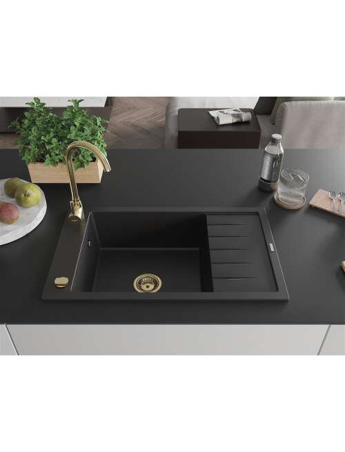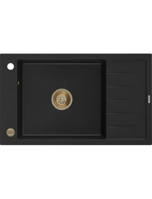 Dane techniczne: Rozmiar: 795x480x200 mm Głębokość komory: 190 mm Wymiary komory: 465x420 mm Średnica odpływu: ø90 mm Rodzaj: 1-komorowy z krótkim ociekaczem Typ: Wpuszczany w blat Materiał: Granit Kolor: Czarny Wykończenie syfonu: Złoty Otwór przelewowy: Tak Otwór na baterie: Tak Syfon automatyczny w komplecie Wysoka odporność na zarysowania i przebarwienia Odporność na szok termiczny Powierzchnia ułatwiająca czyszczenie Jeden dodatkowy podfrezowany otwór do samodzielnego wybicia ø35 |