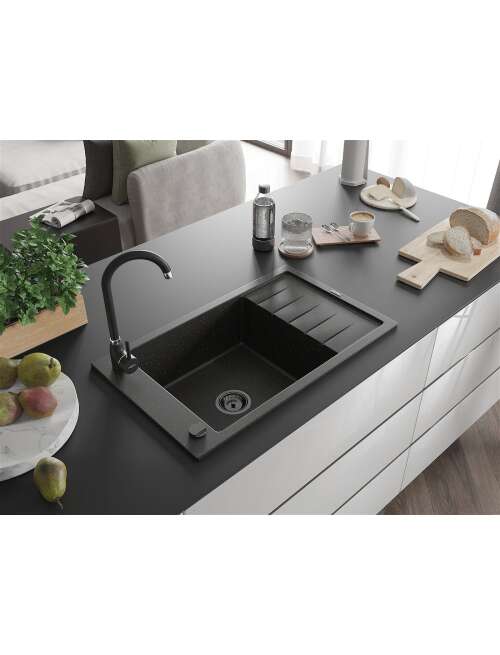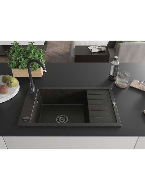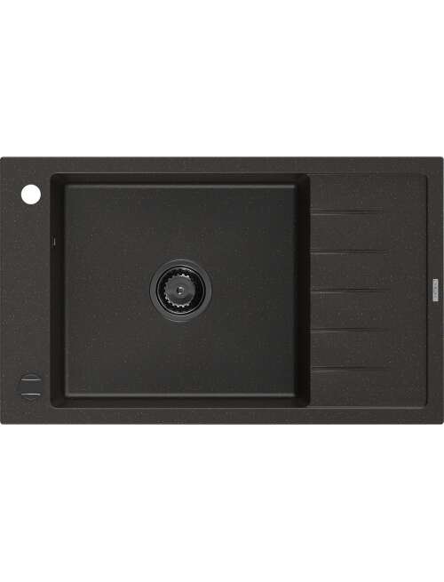 Dane techniczne: Rozmiar: 795x480x200 mm Głębokość komory: 190 mm Wymiary komory: 465x420 mm Średnica odpływu: ø90 mm Rodzaj: 1-komorowy z krótkim ociekaczem Typ: Wpuszczany w blat Materiał: Granit Kolor: Czarny/Złoty metalik Wykończenie syfonu: Czarny Otwór przelewowy: Tak Otwór na baterie: Tak Syfon automatyczny w komplecie Wysoka odporność na zarysowania i przebarwienia Odporność na szok termiczny Powierzchnia ułatwiająca czyszczenie Jeden dodatkowy podfrezowany otwór do samodzielnego wybicia ø35 |
