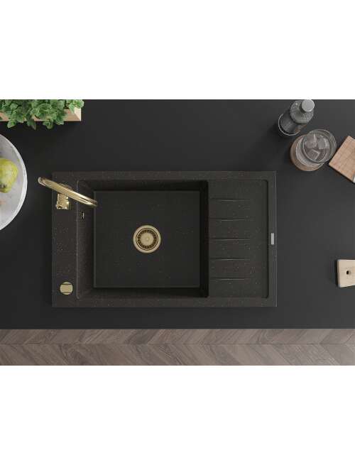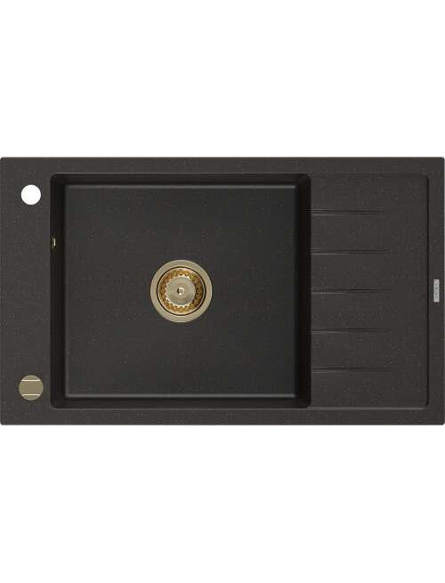 Mexen Elias zlewozmywak granitowy 1-komorowy z ociekaczem 795 x 480 mm, czarny/złoty metalik, syfon złoty - 6511791005-75-G