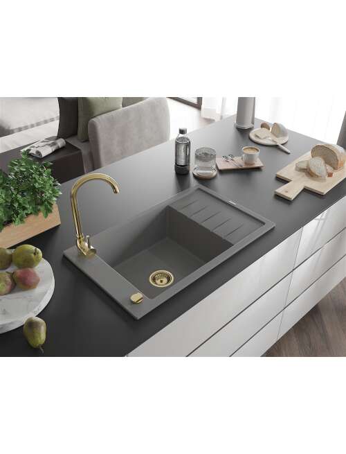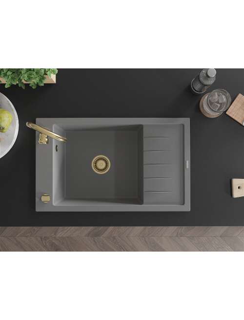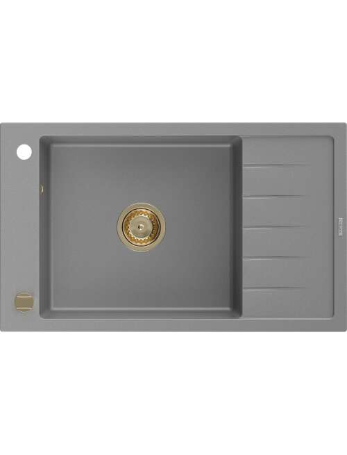 Mexen Elias zlewozmywak granitowy 1-komorowy z ociekaczem 795 x 480 mm, szary, syfon złoty - 6511791005-71-G