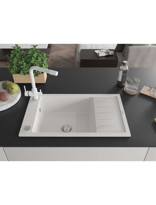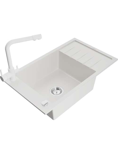 Mexen Elias zlewozmywak granitowy 1-komorowy z ociekaczem i baterią kuchenną Duero, biały - 6511-20-671600-20