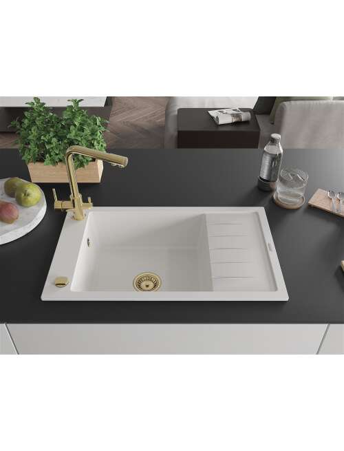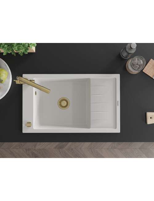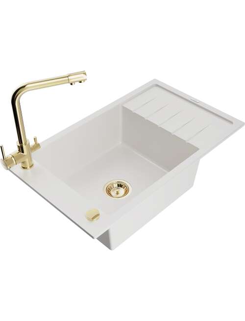 Dane techniczne: Zlewozmywak: Rozmiar: 795x480x200 mm Głębokość komory: 190 mm Wymiary komory: 465x420 mm Średnica odpływu: ø90 mm Typ: 1-komorowy z krótkim ociekaczem Rodzaj: Wpuszczany w blat Kolor: Biały Wykończenie syfonu: Złoty Materiał: Granit (80% kruszywo granitowe 20% żywice) Otwór przelewowy: Tak Otwory: ( bateria, automat ) 2 Montaż: Uniwersalny, możliwość montażu z ociekaczem po lewej lub prawej stronie Wysoka odporność na zarysowania i przebarwienia Odporność na szok termiczny Powierzchnia ułatwiająca czyszczenie Jeden dodatkowy podfrezowany otwór do samodzielnego wybicia ø35 Bateria kuchenna: Materiał: Mosiądz Kolor: Złoty Głowica: Ceramiczna Perlator: Tak Typ: Dwuuchwytowa Zasięg wylewki: 235 mm Wysokość baterii: 315 mm Bateria dwugłowicowa z dodatkowym filtrem do wody pitnej |