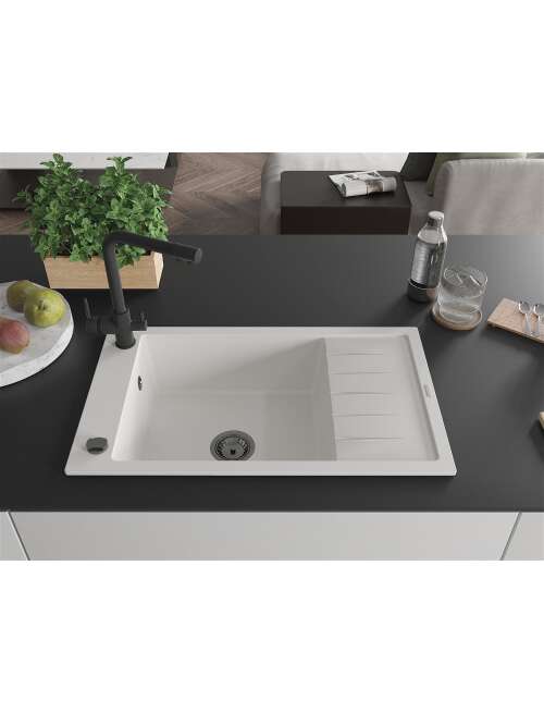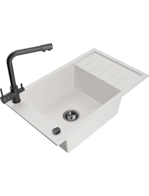 Dane techniczne: Zlewozmywak: Rozmiar: 795x480x200 mm Głębokość komory: 190 mm Wymiary komory: 465x420 mm Średnica odpływu: ø90 mm Typ: 1-komorowy z krótkim ociekaczem Rodzaj: Wpuszczany w blat Kolor: Biały Wykończenie syfonu: Czarny Materiał: Granit (80% kruszywo granitowe 20% żywice) Otwór przelewowy: Tak Otwory: ( bateria, automat ) 2 Montaż: Uniwersalny, możliwość montażu z ociekaczem po lewej lub prawej stronie Wysoka odporność na zarysowania i przebarwienia Odporność na szok termiczny Powierzchnia ułatwiająca czyszczenie Jeden dodatkowy podfrezowany otwór do samodzielnego wybicia ø35 Bateria kuchenna: Materiał: Mosiądz Kolor: Czarny Głowica: Ceramiczna Perlator: Tak Typ: Dwuuchwytowa Zasięg wylewki: 235 mm Wysokość baterii: 315 mm Bateria dwugłowicowa z dodatkowym filtrem do wody pitnej |