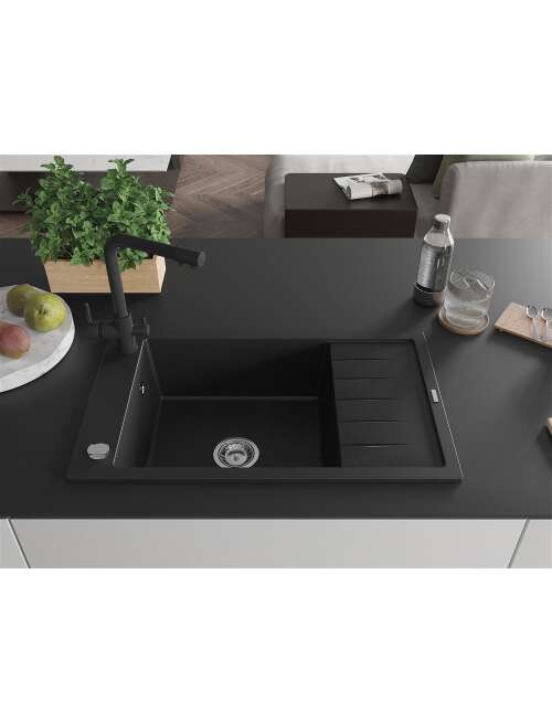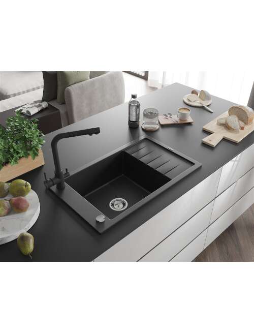 Dane techniczne: Zlewozmywak: Rozmiar: 795x480x200 mm Głębokość komory: 190 mm Wymiary komory: 465x420 mm Średnica odpływu: ø90 mm Typ: 1-komorowy z krótkim ociekaczem Rodzaj: Wpuszczany w blat Kolor: Czarny Wykończenie syfonu: Chrom Materiał: Granit (80% kruszywo granitowe 20% żywice) Otwór przelewowy: Tak Otwory: ( bateria, automat ) 2 Montaż: Uniwersalny, możliwość montażu z ociekaczem po lewej lub prawej stronie Wysoka odporność na zarysowania i przebarwienia Odporność na szok termiczny Powierzchnia ułatwiająca czyszczenie Jeden dodatkowy podfrezowany otwór do samodzielnego wybicia ø35 Bateria kuchenna: Materiał: Mosiądz Kolor: Czarny Głowica: Ceramiczna Perlator: Tak Typ: Dwuuchwytowa Zasięg wylewki: 235 mm Wysokość baterii: 315 mm Bateria dwugłowicowa z dodatkowym filtrem do wody pitnej |