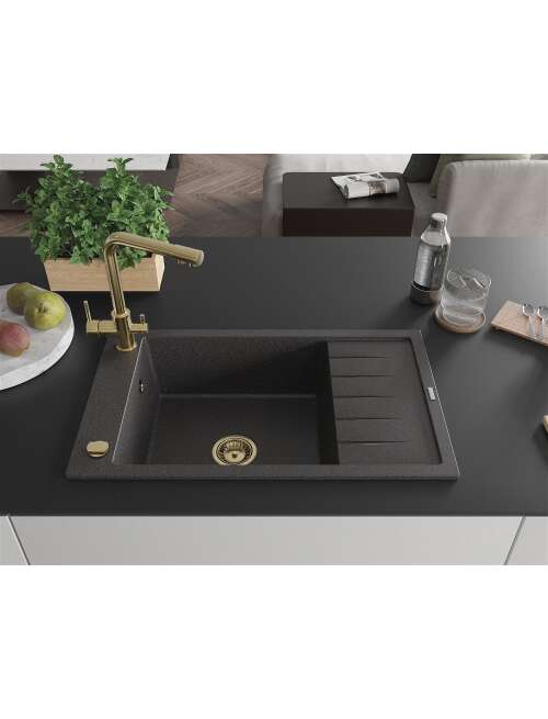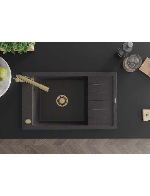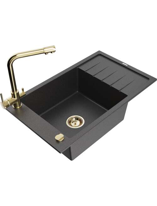 Dane techniczne: Zlewozmywak: Rozmiar: 795x480x200 mm Głębokość komory: 190 mm Wymiary komory: 465x420 mm Średnica odpływu: ø90 mm Typ: 1-komorowy z krótkim ociekaczem Rodzaj: Wpuszczany w blat Kolor: Czarny nakrapiany Wykończenie syfonu: Złoty Materiał: Granit (80% kruszywo granitowe 20% żywice) Otwór przelewowy: Tak Otwory: ( bateria, automat ) 2 Montaż: Uniwersalny, możliwość montażu z ociekaczem po lewej lub prawej stronie Wysoka odporność na zarysowania i przebarwienia Odporność na szok termiczny Powierzchnia ułatwiająca czyszczenie Jeden dodatkowy podfrezowany otwór do samodzielnego wybicia ø35 Bateria kuchenna: Materiał: Mosiądz Kolor: Złoty Głowica: Ceramiczna Perlator: Tak Typ: Dwuuchwytowa Zasięg wylewki: 235 mm Wysokość baterii: 315 mm Bateria dwugłowicowa z dodatkowym filtrem do wody pitnej |