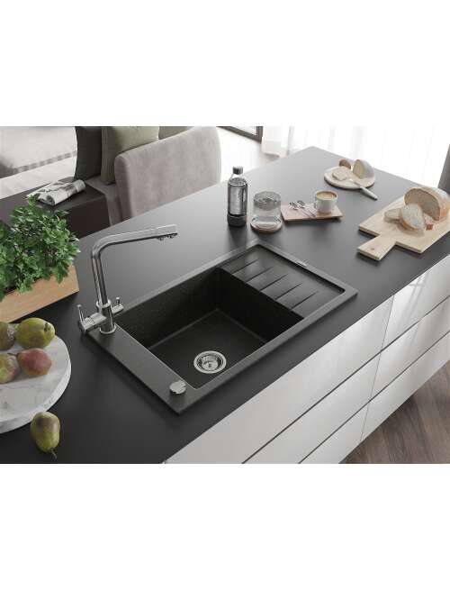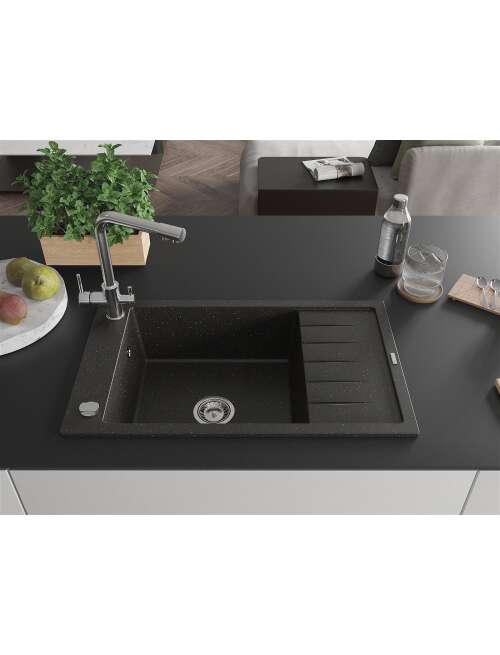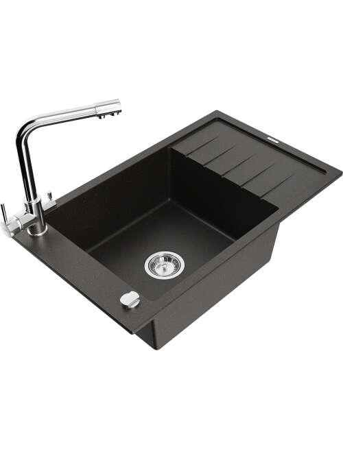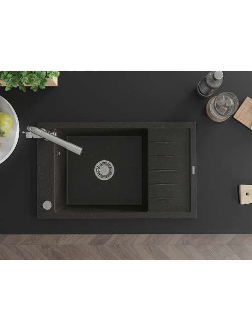 Mexen Elias zlewozmywak granitowy 1-komorowy z ociekaczem i baterią kuchenną Duero, czarny/złoty metalik - 6511-75-671600-00