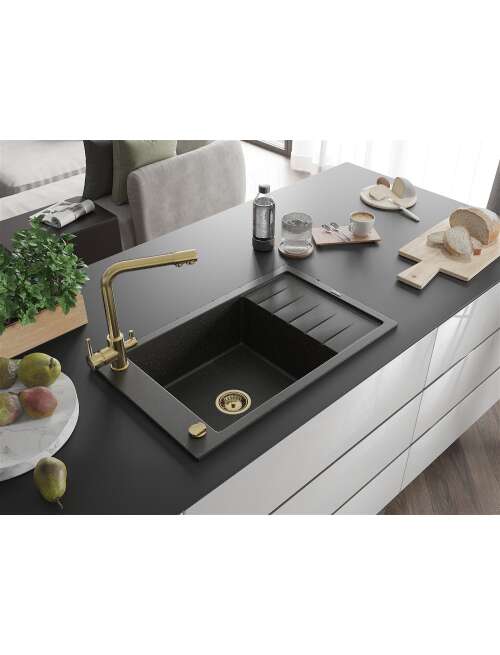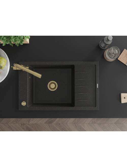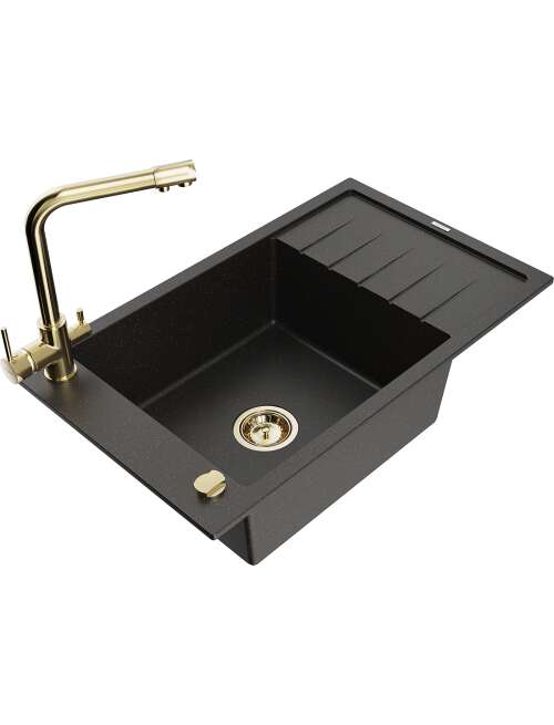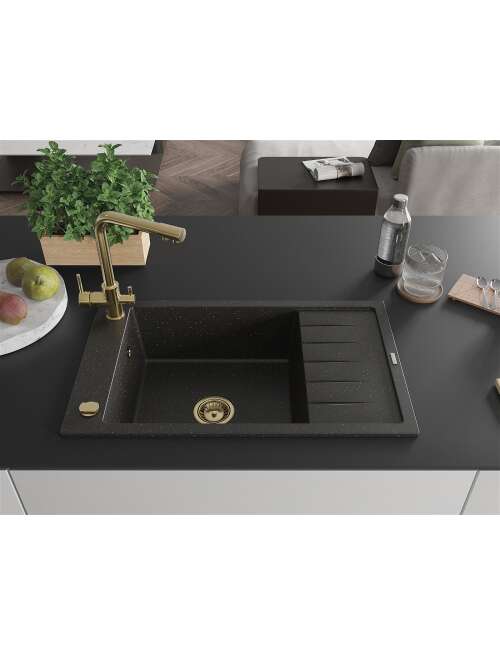 Mexen Elias zlewozmywak granitowy 1-komorowy z ociekaczem i baterią kuchenną Duero, czarny/złoty metalik - 6511-75-671600-50
