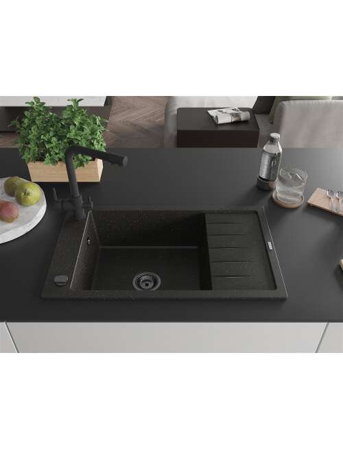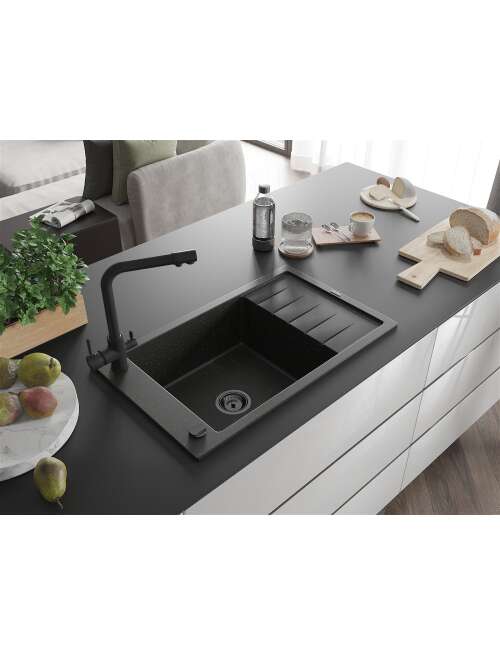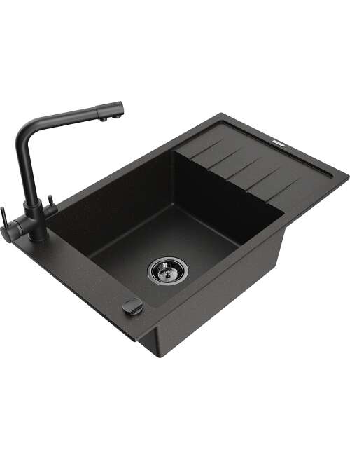 Dane techniczne: Zlewozmywak: Rozmiar: 795x480x200 mm Głębokość komory: 190 mm Wymiary komory: 465x420 mm Średnica odpływu: ø90 mm Typ: 1-komorowy z krótkim ociekaczem Rodzaj: Wpuszczany w blat Kolor: Czarny/Złoty metalik Wykończenie syfonu: Czarny Materiał: Granit (80% kruszywo granitowe 20% żywice) Otwór przelewowy: Tak Otwory: ( bateria, automat ) 2 Montaż: Uniwersalny, możliwość montażu z ociekaczem po lewej lub prawej stronie Wysoka odporność na zarysowania i przebarwienia Odporność na szok termiczny Powierzchnia ułatwiająca czyszczenie Jeden dodatkowy podfrezowany otwór do samodzielnego wybicia ø35 Bateria kuchenna: Materiał: Mosiądz Kolor: Czarny Głowica: Ceramiczna Perlator: Tak Typ: Dwuuchwytowa Zasięg wylewki: 235 mm Wysokość baterii: 315 mm Bateria dwugłowicowa z dodatkowym filtrem do wody pitnej |
