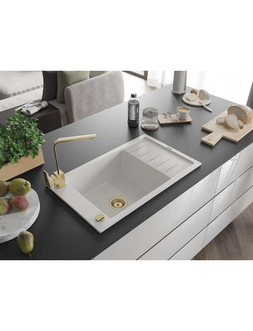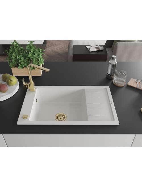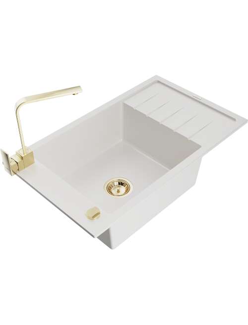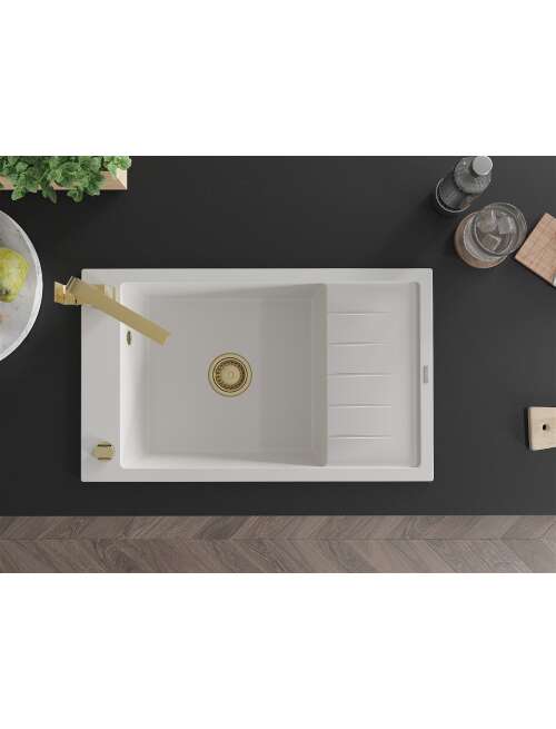 Dane techniczne: Zlewozmywak: Rozmiar: 795x480x200 mm Głębokość komory: 190 mm Wymiary komory: 465x420 mm Średnica odpływu: ø90 mm Typ: 1-komorowy z krótkim ociekaczem Rodzaj: Wpuszczany w blat Kolor: Biały Wykończenie syfonu: Złoty Materiał: Granit (80% kruszywo granitowe 20% żywice) Otwór przelewowy: Tak Otwory: ( bateria, automat ) 2 Montaż: Uniwersalny, możliwość montażu z ociekaczem po lewej lub prawej stronie Wysoka odporność na zarysowania i przebarwienia Odporność na szok termiczny Powierzchnia ułatwiająca czyszczenie Jeden dodatkowy podfrezowany otwór do samodzielnego wybicia ø35 Bateria kuchenna: Materiał: Mosiądz Kolor: Złoty Głowica: Ceramiczna Perlator: Tak Typ: Jednouchwytowa Wysokość baterii: 290 mm Zasięg wylewki: 220 mm |