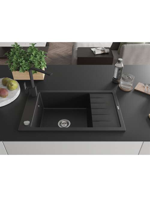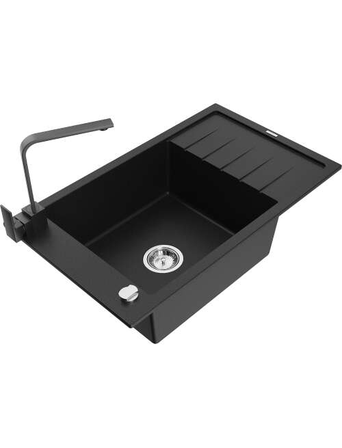 Mexen Elias zlewozmywak granitowy 1-komorowy z ociekaczem i baterią kuchenną Rita, czarny - 6511-77-670300-70