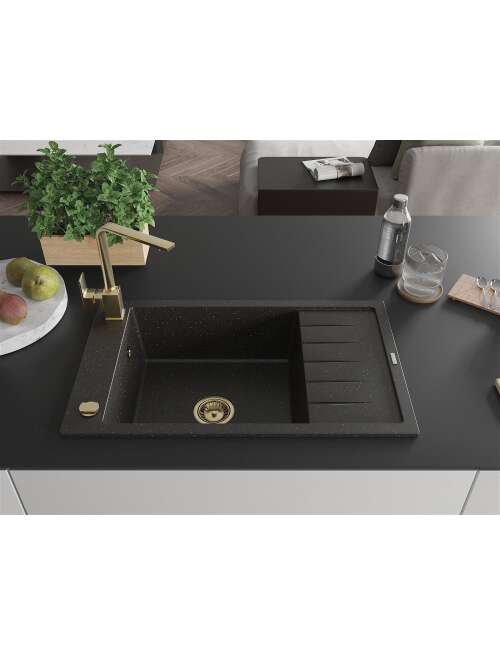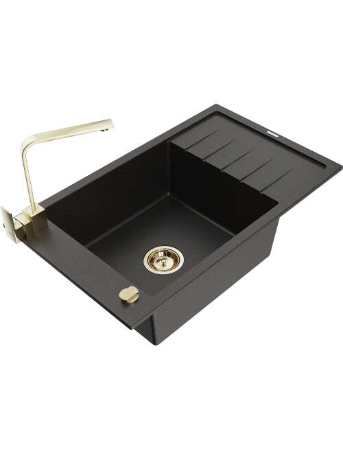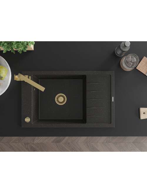 Dane techniczne: Zlewozmywak: Rozmiar: 795x480x200 mm Głębokość komory: 190 mm Wymiary komory: 465x420 mm Średnica odpływu: ø90 mm Typ: 1-komorowy z krótkim ociekaczem Rodzaj: Wpuszczany w blat Kolor: Czarny/Złoty metalik Wykończenie syfonu: Złoty Materiał: Granit (80% kruszywo granitowe 20% żywice) Otwór przelewowy: Tak Otwory: ( bateria, automat ) 2 Montaż: Uniwersalny, możliwość montażu z ociekaczem po lewej lub prawej stronie Wysoka odporność na zarysowania i przebarwienia Odporność na szok termiczny Powierzchnia ułatwiająca czyszczenie Jeden dodatkowy podfrezowany otwór do samodzielnego wybicia ø35 Bateria kuchenna: Materiał: Mosiądz Kolor: Złoty Głowica: Ceramiczna Perlator: Tak Typ: Jednouchwytowa Wysokość baterii: 290 mm Zasięg wylewki: 220 mm |