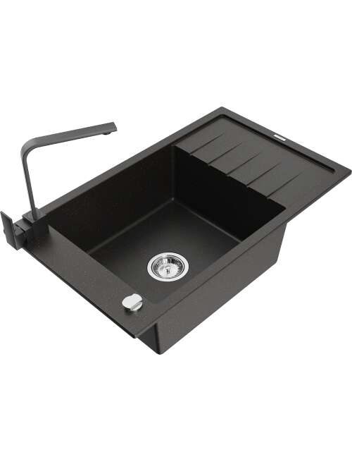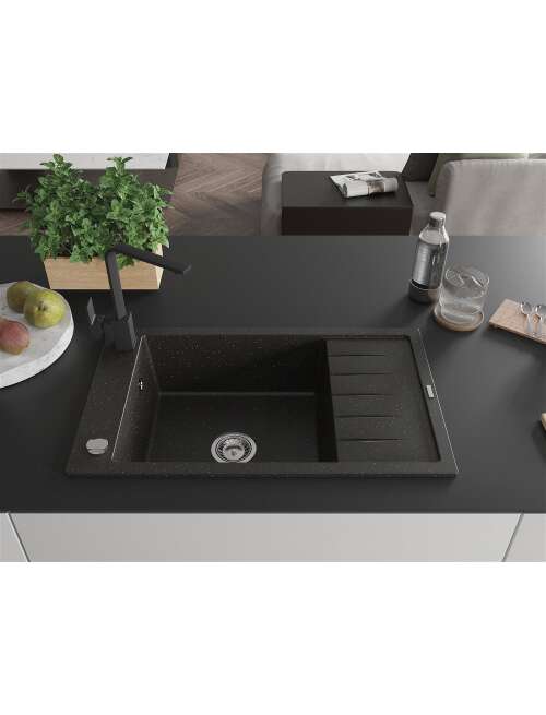 Dane techniczne: Zlewozmywak: Rozmiar: 795x480x200 mm Głębokość komory: 190 mm Wymiary komory: 465x420 mm Średnica odpływu: ø90 mm Typ: 1-komorowy z krótkim ociekaczem Rodzaj: Wpuszczany w blat Kolor: Czarny/Złoty metalik Wykończenie syfonu: Chrom Materiał: Granit (80% kruszywo granitowe 20% żywice) Otwór przelewowy: Tak Otwory: ( bateria, automat ) 2 Montaż: Uniwersalny, możliwość montażu z ociekaczem po lewej lub prawej stronie Wysoka odporność na zarysowania i przebarwienia Odporność na szok termiczny Powierzchnia ułatwiająca czyszczenie Jeden dodatkowy podfrezowany otwór do samodzielnego wybicia ø35 Bateria kuchenna: Materiał: Mosiądz Kolor: Czarny Głowica: Ceramiczna Perlator: Tak Typ: Jednouchwytowa Wysokość baterii: 290 mm Zasięg wylewki: 220 mm |