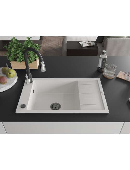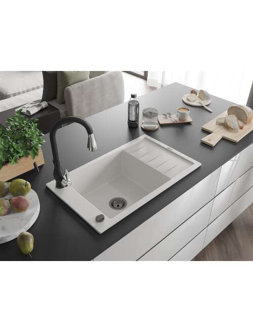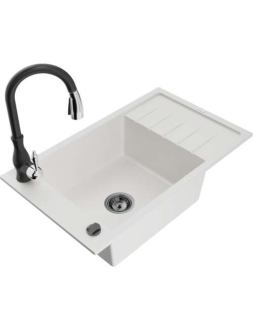 Dane techniczne: Zlewozmywak: Rozmiar: 795x480x200 mm Głębokość komory: 190 mm Wymiary komory: 465x420 mm Średnica odpływu: ø90 mm Typ: 1-komorowy z krótkim ociekaczem Rodzaj: Wpuszczany w blat Kolor: Biały Wykończenie syfonu: Czarny Materiał: Granit (80% kruszywo granitowe 20% żywice) Otwór przelewowy: Tak Otwory: ( bateria, automat ) 2 Montaż: Uniwersalny, możliwość montażu z ociekaczem po lewej lub prawej stronie Wysoka odporność na zarysowania i przebarwienia Odporność na szok termiczny Powierzchnia ułatwiająca czyszczenie Jeden dodatkowy podfrezowany otwór do samodzielnego wybicia ø35 Bateria kuchenna: Materiał: Mosiądz Kolor: Czarny Głowica: Ceramiczna Perlator: Tak Typ: Jednouchwytowa Wysokość baterii: 410 mm Zasięg wylewki: 231 mm |