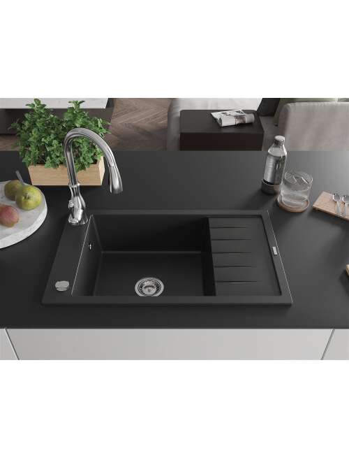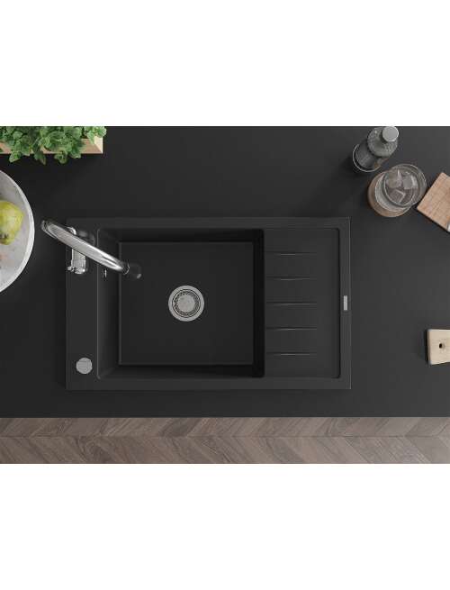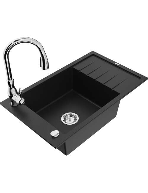 Mexen Elias zlewozmywak granitowy 1-komorowy z ociekaczem i baterią kuchenną Savita, czarny - 6511-77-672601-00