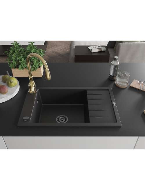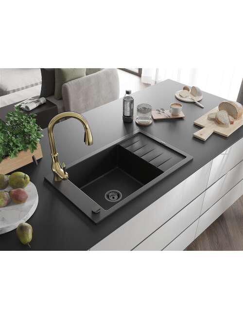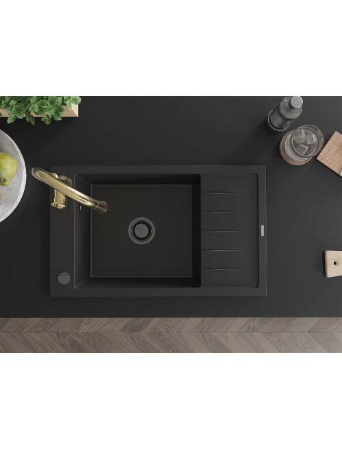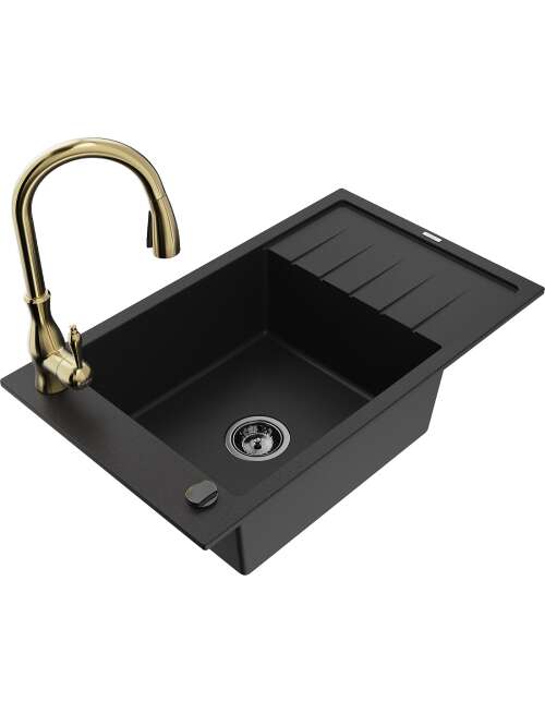 Mexen Elias zlewozmywak granitowy 1-komorowy z ociekaczem i baterią kuchenną Savita, czarny - 6511-77-672601-50-B