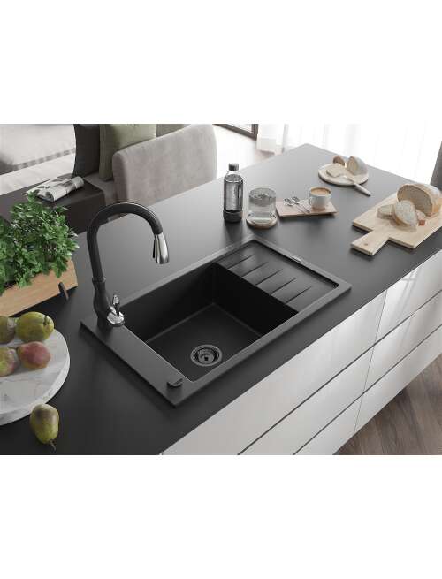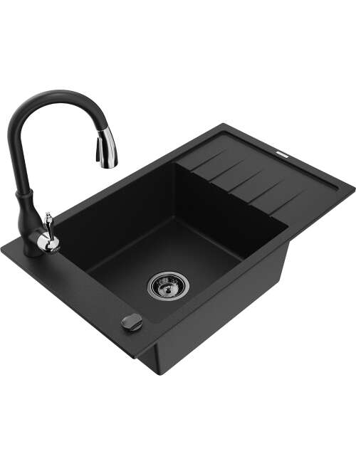 Mexen Elias zlewozmywak granitowy 1-komorowy z ociekaczem i baterią kuchenną Savita, czarny - 6511-77-672601-70-B