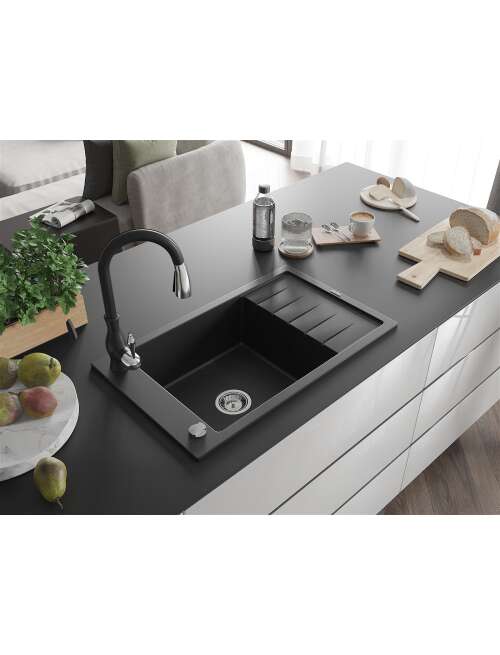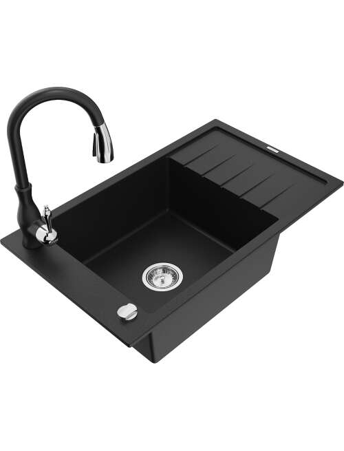 Mexen Elias zlewozmywak granitowy 1-komorowy z ociekaczem i baterią kuchenną Savita, czarny - 6511-77-672601-70