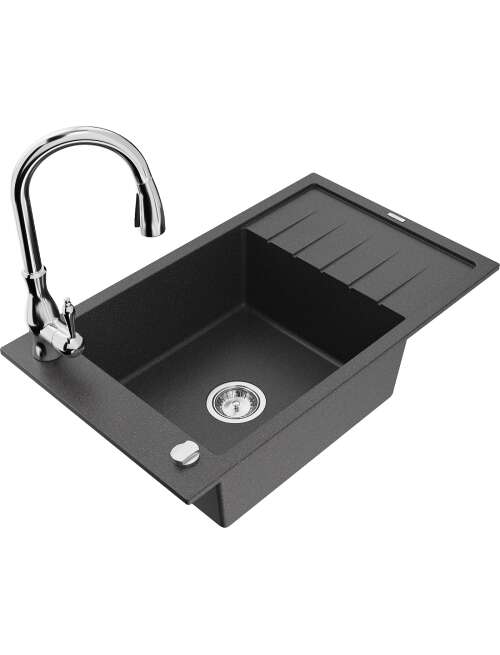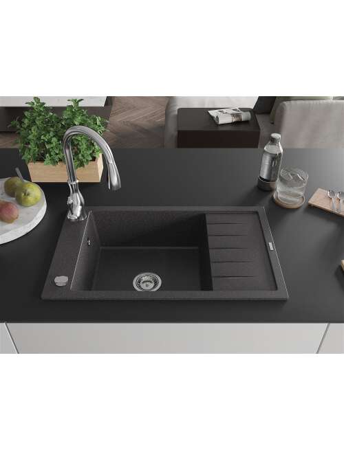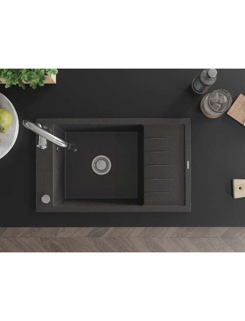 Dane techniczne: Zlewozmywak: Rozmiar: 795x480x200 mm Głębokość komory: 190 mm Wymiary komory: 465x420 mm Średnica odpływu: ø90 mm Typ: 1-komorowy z krótkim ociekaczem Rodzaj: Wpuszczany w blat Kolor: Czarny nakrapiany Wykończenie syfonu: Chrom Materiał: Granit (80% kruszywo granitowe 20% żywice) Otwór przelewowy: Tak Otwory: ( bateria, automat ) 2 Montaż: Uniwersalny, możliwość montażu z ociekaczem po lewej lub prawej stronie Wysoka odporność na zarysowania i przebarwienia Odporność na szok termiczny Powierzchnia ułatwiająca czyszczenie Jeden dodatkowy podfrezowany otwór do samodzielnego wybicia ø35 Bateria kuchenna: Materiał: Mosiądz Kolor: Chrom Głowica: Ceramiczna Perlator: Tak Typ: Jednouchwytowa Wysokość baterii: 410 mm Zasięg wylewki: 231 mm |