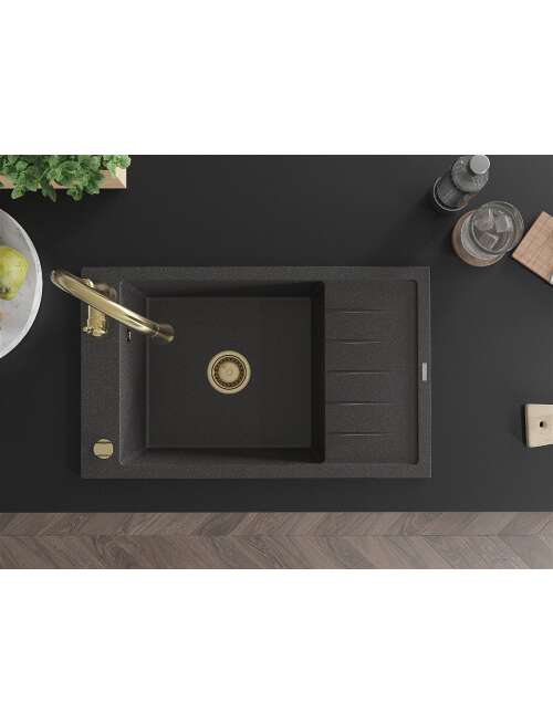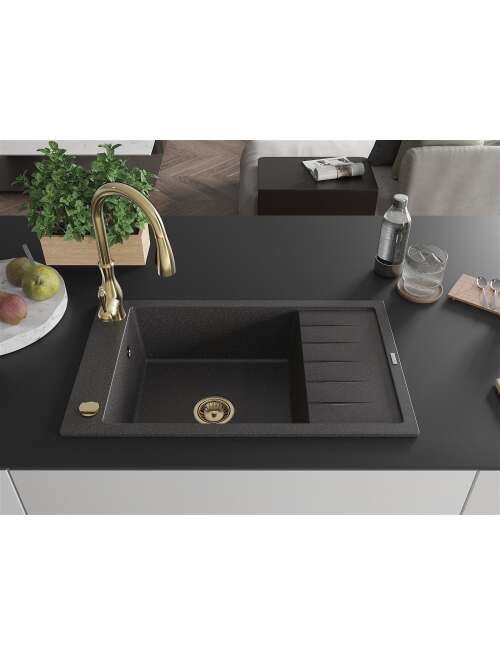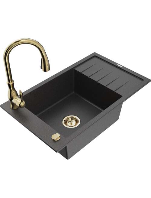Mexen Elias zlewozmywak granitowy 1-komorowy z ociekaczem i baterią kuchenną Savita, czarny nakrapiany - 6511-76-672601-50