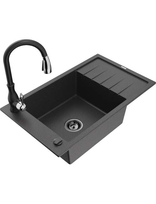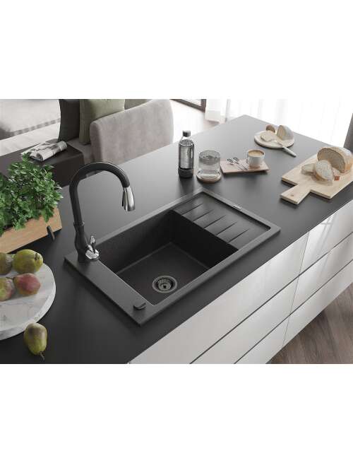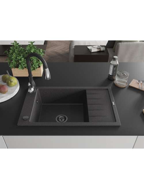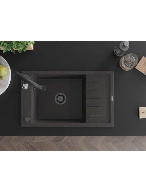 Dane techniczne: Zlewozmywak: Rozmiar: 795x480x200 mm Głębokość komory: 190 mm Wymiary komory: 465x420 mm Średnica odpływu: ø90 mm Typ: 1-komorowy z krótkim ociekaczem Rodzaj: Wpuszczany w blat Kolor: Czarny nakrapiany Wykończenie syfonu: Czarny Materiał: Granit (80% kruszywo granitowe 20% żywice) Otwór przelewowy: Tak Otwory: ( bateria, automat ) 2 Montaż: Uniwersalny, możliwość montażu z ociekaczem po lewej lub prawej stronie Wysoka odporność na zarysowania i przebarwienia Odporność na szok termiczny Powierzchnia ułatwiająca czyszczenie Jeden dodatkowy podfrezowany otwór do samodzielnego wybicia ø35 Bateria kuchenna: Materiał: Mosiądz Kolor: Czarny Głowica: Ceramiczna Perlator: Tak Typ: Jednouchwytowa Wysokość baterii: 410 mm Zasięg wylewki: 231 mm |