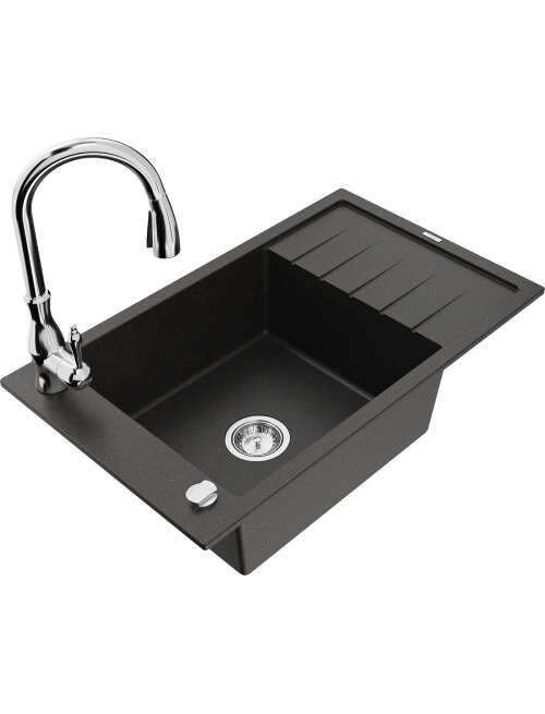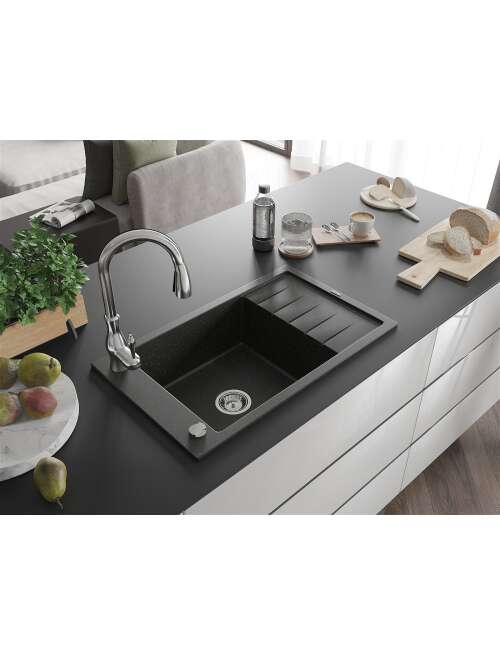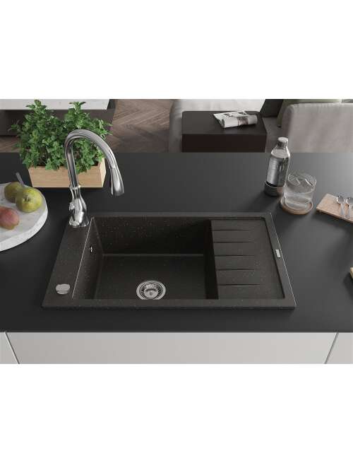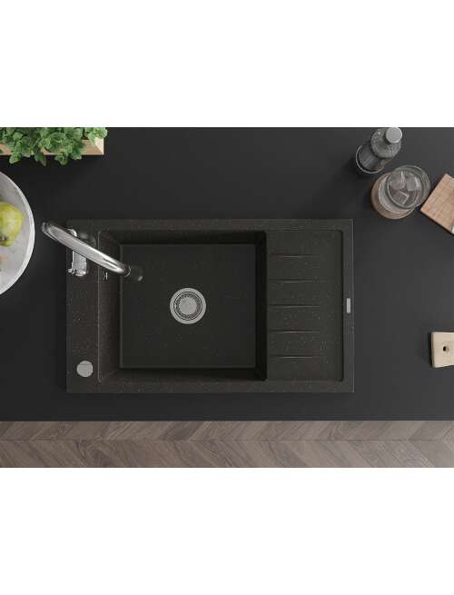 Dane techniczne: Zlewozmywak: Rozmiar: 795x480x200 mm Głębokość komory: 190 mm Wymiary komory: 465x420 mm Średnica odpływu: ø90 mm Typ: 1-komorowy z krótkim ociekaczem Rodzaj: Wpuszczany w blat Kolor: Czarny/Złoty metalik Wykończenie syfonu: Chrom Materiał: Granit (80% kruszywo granitowe 20% żywice) Otwór przelewowy: Tak Otwory: ( bateria, automat ) 2 Montaż: Uniwersalny, możliwość montażu z ociekaczem po lewej lub prawej stronie Wysoka odporność na zarysowania i przebarwienia Odporność na szok termiczny Powierzchnia ułatwiająca czyszczenie Jeden dodatkowy podfrezowany otwór do samodzielnego wybicia ø35 Bateria kuchenna: Materiał: Mosiądz Kolor: Chrom Głowica: Ceramiczna Perlator: Tak Typ: Jednouchwytowa Wysokość baterii: 410 mm Zasięg wylewki: 231 mm |