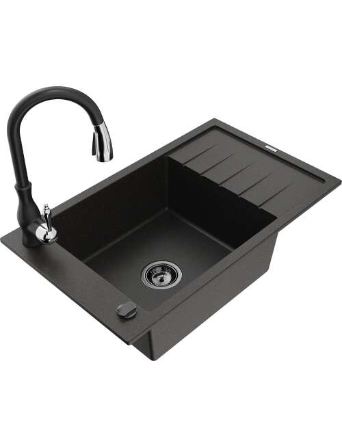 Dane techniczne: Zlewozmywak: Rozmiar: 795x480x200 mm Głębokość komory: 190 mm Wymiary komory: 465x420 mm Średnica odpływu: ø90 mm Typ: 1-komorowy z krótkim ociekaczem Rodzaj: Wpuszczany w blat Kolor: Czarny/Złoty metalik Wykończenie syfonu: Czarny Materiał: Granit (80% kruszywo granitowe 20% żywice) Otwór przelewowy: Tak Otwory: ( bateria, automat ) 2 Montaż: Uniwersalny, możliwość montażu z ociekaczem po lewej lub prawej stronie Wysoka odporność na zarysowania i przebarwienia Odporność na szok termiczny Powierzchnia ułatwiająca czyszczenie Jeden dodatkowy podfrezowany otwór do samodzielnego wybicia ø35 Bateria kuchenna: Materiał: Mosiądz Kolor: Czarny Głowica: Ceramiczna Perlator: Tak Typ: Jednouchwytowa Wysokość baterii: 410 mm Zasięg wylewki: 231 mm |