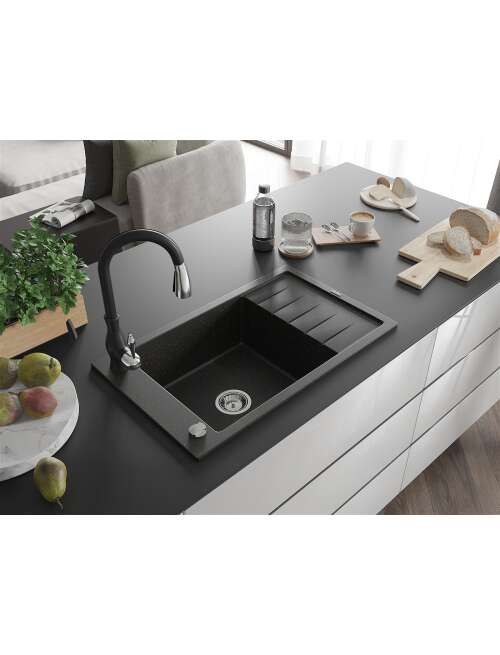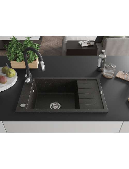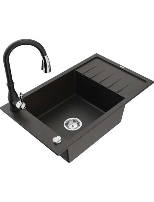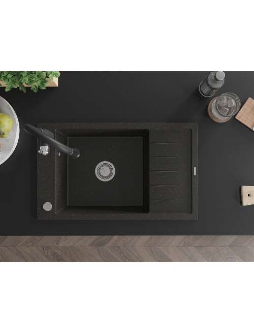 Dane techniczne: Zlewozmywak: Rozmiar: 795x480x200 mm Głębokość komory: 190 mm Wymiary komory: 465x420 mm Średnica odpływu: ø90 mm Typ: 1-komorowy z krótkim ociekaczem Rodzaj: Wpuszczany w blat Kolor: Czarny/Złoty metalik Wykończenie syfonu: Chrom Materiał: Granit (80% kruszywo granitowe 20% żywice) Otwór przelewowy: Tak Otwory: ( bateria, automat ) 2 Montaż: Uniwersalny, możliwość montażu z ociekaczem po lewej lub prawej stronie Wysoka odporność na zarysowania i przebarwienia Odporność na szok termiczny Powierzchnia ułatwiająca czyszczenie Jeden dodatkowy podfrezowany otwór do samodzielnego wybicia ø35 Bateria kuchenna: Materiał: Mosiądz Kolor: Czarny Głowica: Ceramiczna Perlator: Tak Typ: Jednouchwytowa Wysokość baterii: 410 mm Zasięg wylewki: 231 mm |