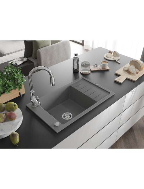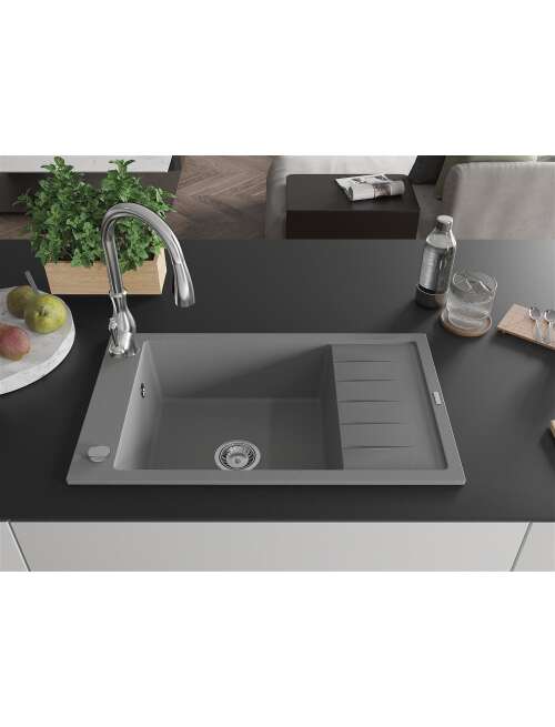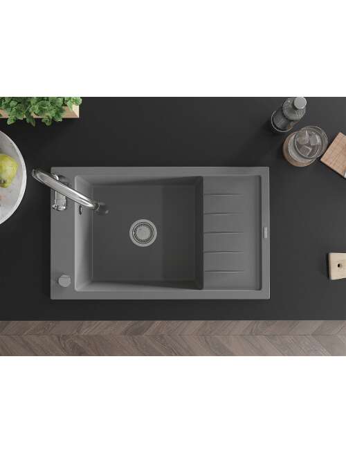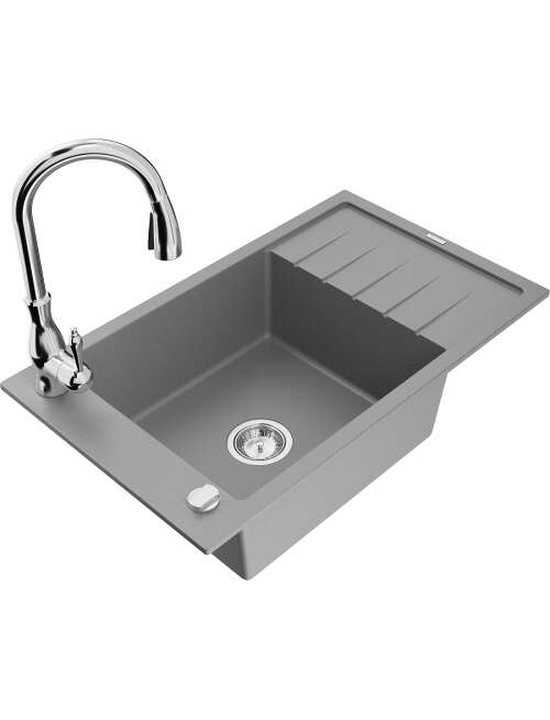 Mexen Elias zlewozmywak granitowy 1-komorowy z ociekaczem i baterią kuchenną Savita, szary - 6511-71-672601-00