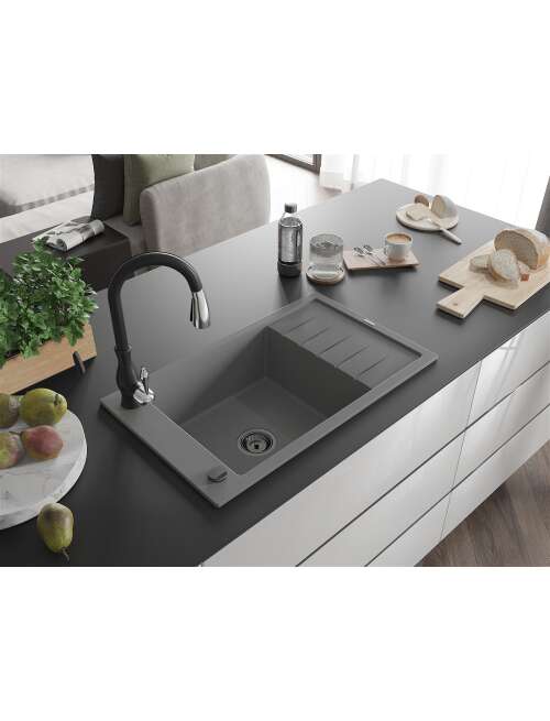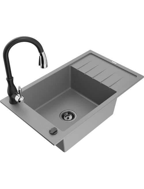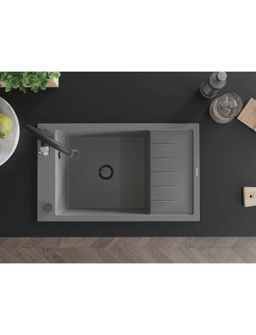 Dane techniczne: Zlewozmywak: Rozmiar: 795x480x200 mm Głębokość komory: 190 mm Wymiary komory: 465x420 mm Średnica odpływu: ø90 mm Typ: 1-komorowy z krótkim ociekaczem Rodzaj: Wpuszczany w blat Kolor: Szary Wykończenie syfonu: Czarny Materiał: Granit (80% kruszywo granitowe 20% żywice) Otwór przelewowy: Tak Otwory: ( bateria, automat ) 2 Montaż: Uniwersalny, możliwość montażu z ociekaczem po lewej lub prawej stronie Wysoka odporność na zarysowania i przebarwienia Odporność na szok termiczny Powierzchnia ułatwiająca czyszczenie Jeden dodatkowy podfrezowany otwór do samodzielnego wybicia ø35 Bateria kuchenna: Materiał: Mosiądz Kolor: Czarny Głowica: Ceramiczna Perlator: Tak Typ: Jednouchwytowa Wysokość baterii: 410 mm Zasięg wylewki: 231 mm |
