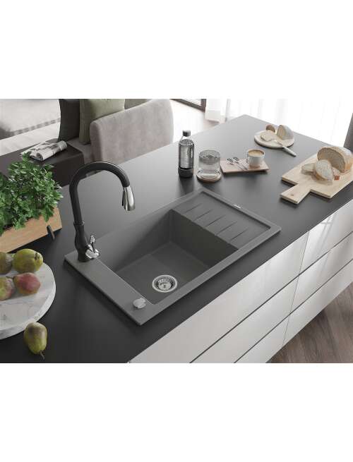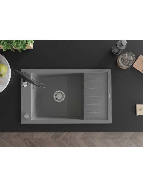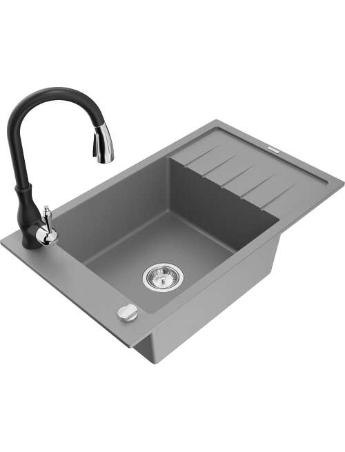 Mexen Elias zlewozmywak granitowy 1-komorowy z ociekaczem i baterią kuchenną Savita, szary - 6511-71-672601-70