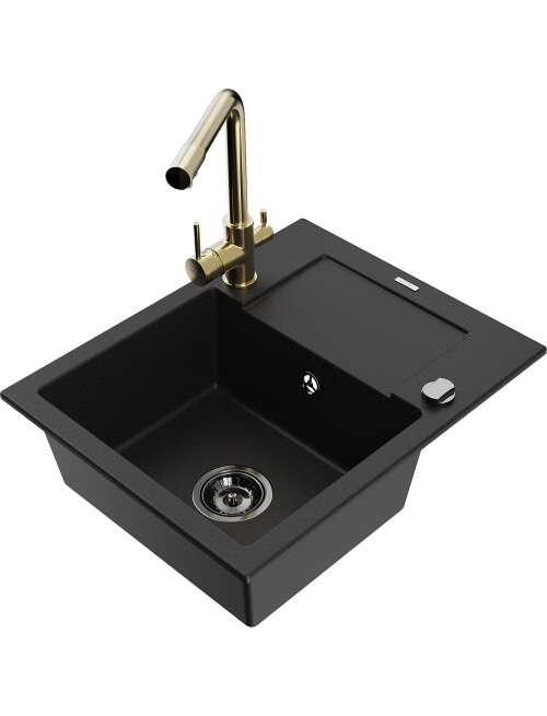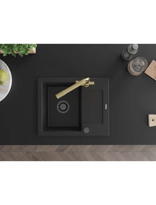 Mexen Enzo zlewozmywak granitowy 1-komorowy z ociekaczem i baterią kuchenną Duero, czarny - 6506-77-671600-50-B