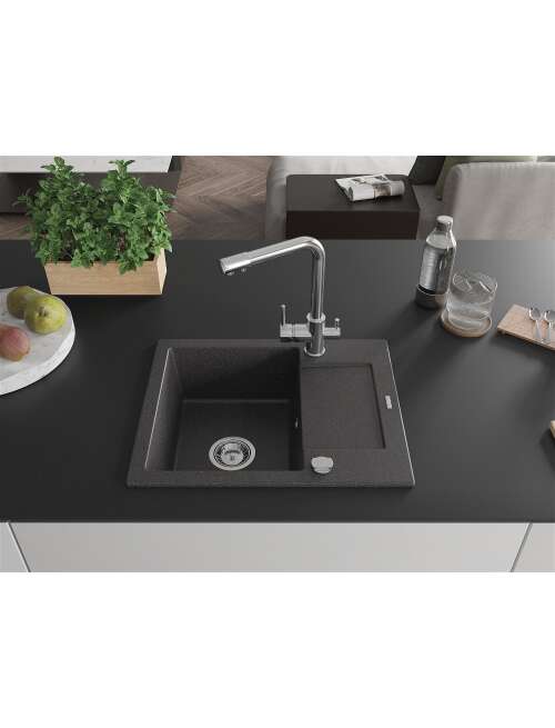 Dane techniczne: Zlewozmywak: Rozmiar: 576x465x174 mm Głębokość komory: 164 mm Wymiary komory: 395x320 mm Średnica odpływu: ø90 mm Typ: 1-komorowy z krótkim ociekaczem Rodzaj: Wpuszczany w blat Kolor: Czarny nakrapiany Wykończenie syfonu: Chrom Materiał: Granit (80% kruszywo granitowe 20% żywice) Otwór przelewowy: Tak Otwory: ( bateria, automat ) 2 Montaż: Uniwersalny, możliwość montażu z ociekaczem po lewej lub prawej stronie Wysoka odporność na zarysowania i przebarwienia Odporność na szok termiczny Powierzchnia ułatwiająca czyszczenie Dwa dodatkowe podfrezowane otwory do samodzielnego wybicia ø35 Bateria kuchenna: Materiał: Mosiądz Kolor: Chrom Głowica: Ceramiczna Perlator: Tak Typ: Dwuuchwytowa Zasięg wylewki: 235 mm Wysokość baterii: 315 mm Bateria dwugłowicowa z dodatkowym filtrem do wody pitnej |