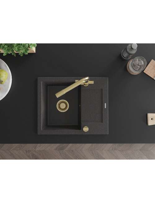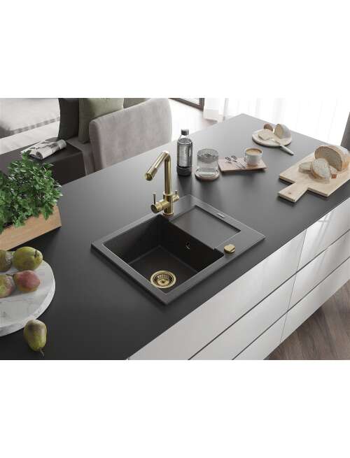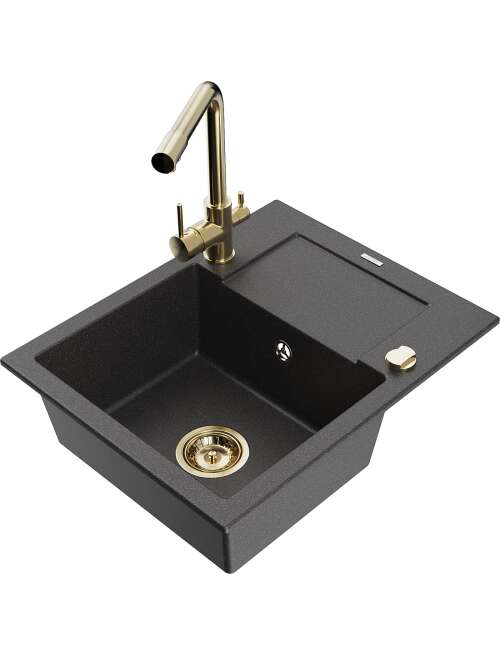 Dane techniczne: Zlewozmywak: Rozmiar: 576x465x174 mm Głębokość komory: 164 mm Wymiary komory: 395x320 mm Średnica odpływu: ø90 mm Typ: 1-komorowy z krótkim ociekaczem Rodzaj: Wpuszczany w blat Kolor: Czarny nakrapiany Wykończenie syfonu: Złoty Materiał: Granit (80% kruszywo granitowe 20% żywice) Otwór przelewowy: Tak Otwory: ( bateria, automat ) 2 Montaż: Uniwersalny, możliwość montażu z ociekaczem po lewej lub prawej stronie Wysoka odporność na zarysowania i przebarwienia Odporność na szok termiczny Powierzchnia ułatwiająca czyszczenie Dwa dodatkowe podfrezowane otwory do samodzielnego wybicia ø35 Bateria kuchenna: Materiał: Mosiądz Kolor: Złoty Głowica: Ceramiczna Perlator: Tak Typ: Dwuuchwytowa Zasięg wylewki: 235 mm Wysokość baterii: 315 mm Bateria dwugłowicowa z dodatkowym filtrem do wody pitnej |
